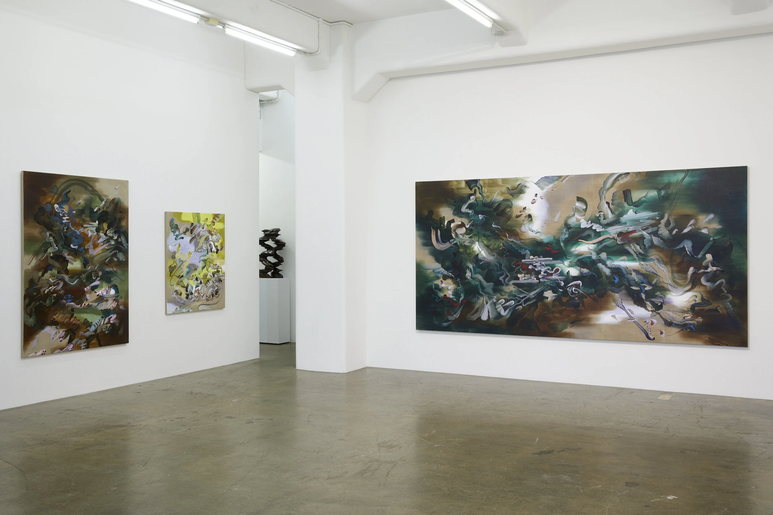 My current body of painting explores surface tension through gesture and space, and it rethinks the historical context of painting today. Each of my paintings interweaves tonal colour planes throughout fleshy, coiling gestures. These curving, sensuous forms cluster into hives of pulsating drama before spinning out into areas of harmonious depth. This process is an attempt to build a fictional landscape and atmosphere of fantasy. Inherently intuitive and unplanned, each gesture responds to the last, mapping out an unknown terrain, creating a heightened sense of tension and release. The final composition emerges through attempting to draw out a logic specific to each work.
